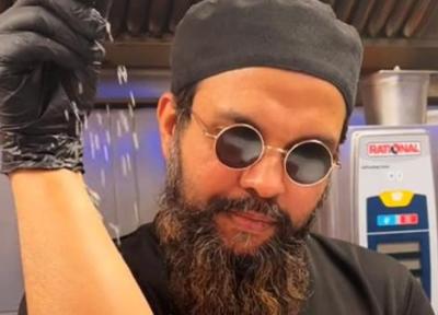این سرآشپز 44 ساله متولد بنگلادش با عینک آفتابی گرد روی چشمان اش، دستکش لاستیکی مشکی در دستان و کلاه گردی بر روی سرش ظاهر خود را به طور قابل توجهی به شکل نصرت گوکچه در آورده است.