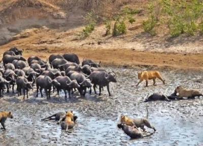 نبرد دراماتیک گله شیر ها با گله بوفالوها
