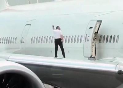 مانور دیوانه وار مهمانداران روی بال هواپیما