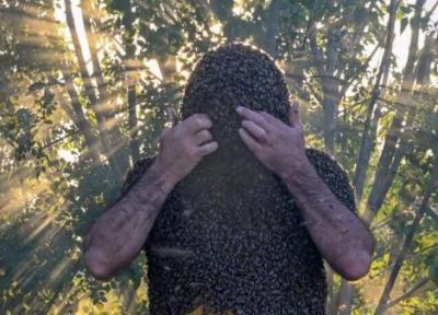تصاویر مردی با هزاران زنبور عسل روی بدنش! ، عجیب ترین روش فروش عسل را ببینید