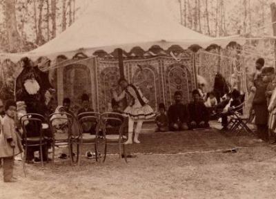 در این عکس که بیش از صد سال قبل در دوران قاجار گرفته شده، شاهد اجرای نوعی نمایش طنز در یک مجلس جشن هستیم. وجود خیمه، فرش ها، صندلی ها و پرده های پر نقش و نگار، همگی نشان از اشرافی یا سلطنتی بودن این مراسم دارند.