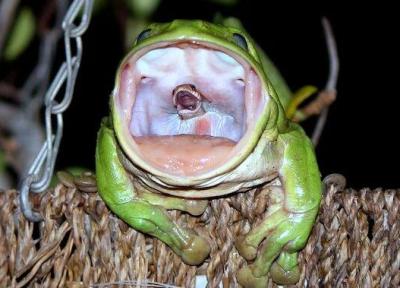 تماشا آخرین تقلای یک مار در دهان یک قورباغه سبز درختی استرالیایی صحنه ای است که کمتر کسی انتظار تماشاش را می کشد!
